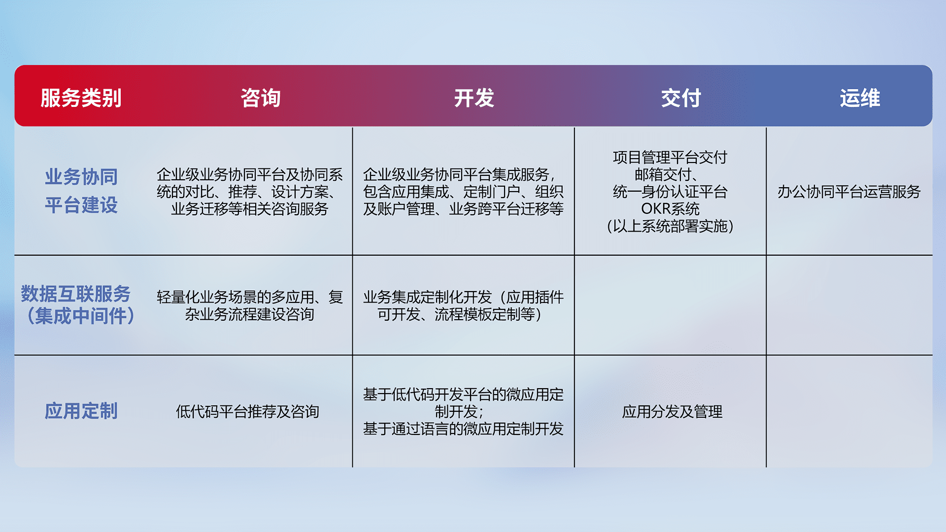 针对钉钉、、、企微、、、IDaas等平台级产品提供产品的规划、、方案、、交付、、、定制化开发等服务,,,实现如统一协同办公、、智能客户服务、、、、混合会议管理、、、智能数据查询、、、、等业务场景,,实现数字化转型。。